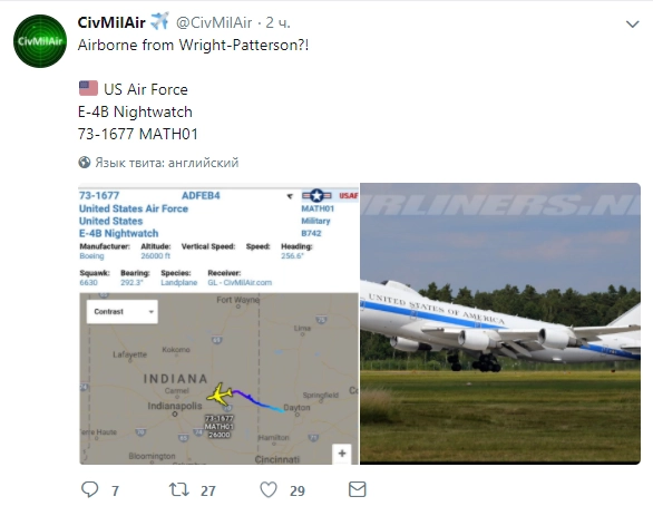 В США поднялся в воздух «самолет Судного дня», следует из данных, опубликованных на сайте CivMilAir. Так называют самолет E-4B Nightwatch. Он предназначен для президента, министра обороны и других высших лиц военного руководства США на случай ядерной войны.