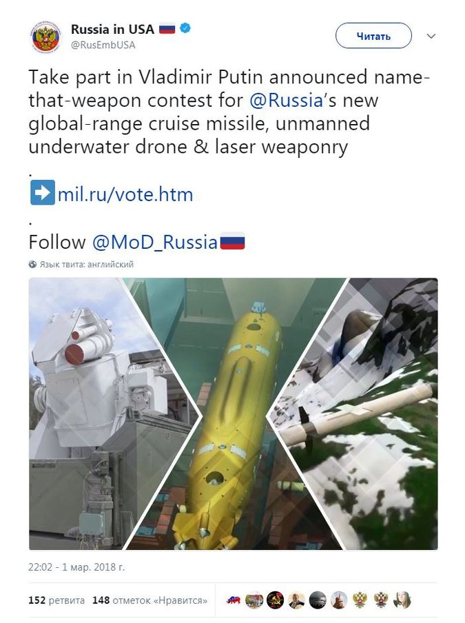 Иностранцы огласили свои варианты названий для трех новейших российских оружейных систем, представленных Владимиром Путиным в послании Федеральному собранию. Предложения от них в своем официальном Twitter принимало посольство России в Вашингтоне.