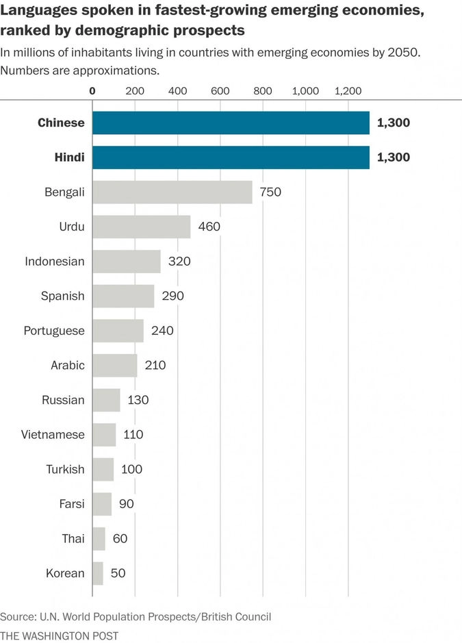 «Согласно данным британских экспертов, к 2050 году в большей части делового мира будут доминировать китайский, хинди, бенгальский, урду и индонезийский язык. За ними будут следовать испанский, португальский, арабский и русский, — отмечает Ноак. — Если вы хотите, чтобы курс иностранного языка был наиболее прибыльным, то беспроигрышный вариант — изучать один из языков, перечисленных выше».