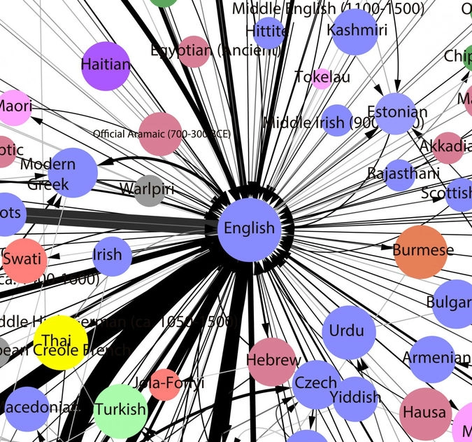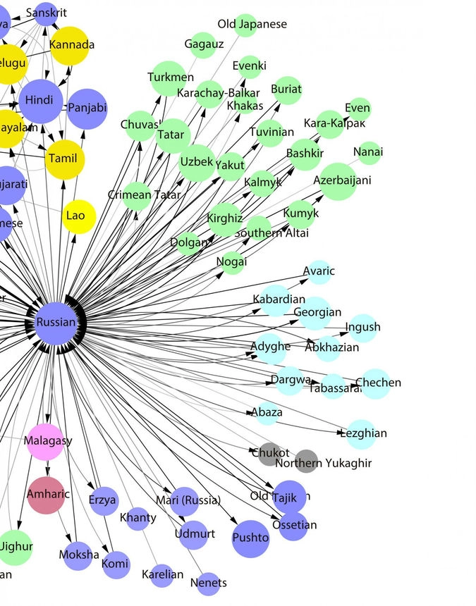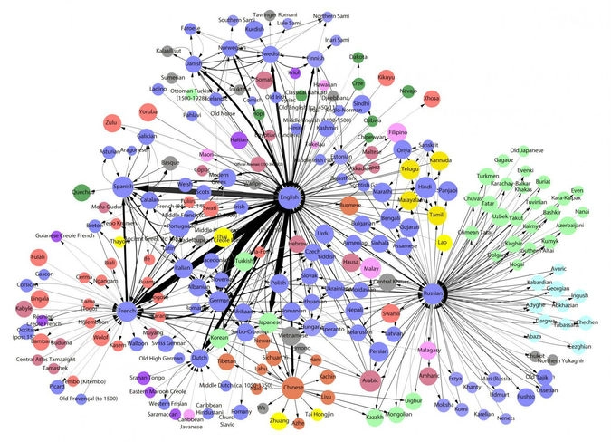 Далее автор сообщает, что группа международных исследователей недавно проанализировала 2,2 млн переводов книг со всего мира. Визуальные материалы, которые они создали на основании данных, предоставленных проектом ЮНЕСКО Index Translationum, позволяют узнать о «мульти-языках», на которые, как правило, переводят книги с менее распространенных языков.