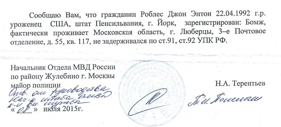 Начальник этого управления (имя мы сочли нужным изъять. — Прим. «Ридуса») мне ясно дал понять: вы приносите или «залог» в 90 тысяч рублей, или мыло и веревку. Он то есть вымогал у меня взятку за то, что мне полагается по закону. В противном случае он мне угрожал, что меня вышлют в США, где мне грозит пожизненное заключение, — возмущается Роблес.