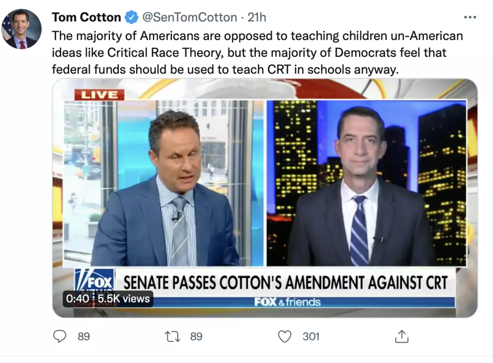 Они хотят научить наших детей тому, что Америка — не хорошая, а расистская нация. Эти учения ошибочны, и доллары из наших налогов не должны их поддерживать, — сказал Коттон.