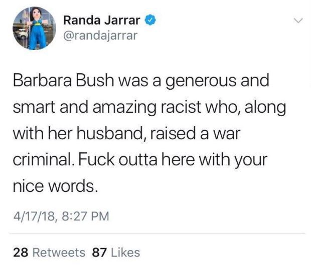 «Вместе со своим мужем (41-й президент США Джордж Буш — старший. — Прим. „Ридуса“) она воспитала военного преступника», — написала Джаррар, называющая себя арабо-американской мусульманкой.