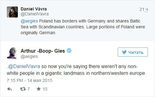 Гис в свою очередь высказал недоумение позицией Вавра, заявив: «То есть теперь вы говорите, что на всей этой огромной территории Северной/Западной Европы отсутствовали небелые люди?».