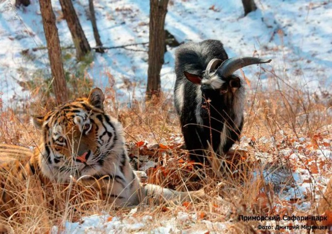 О дружбе тигра и козла, которого привели на съедение хищнику, стало известно 26 ноября. По словам сотрудников сафари-парка, при первой встрече козел дал отпор напавшему на него тигру, после чего хищник не стал связываться с ним. С тех пор животные проводят время вместе.