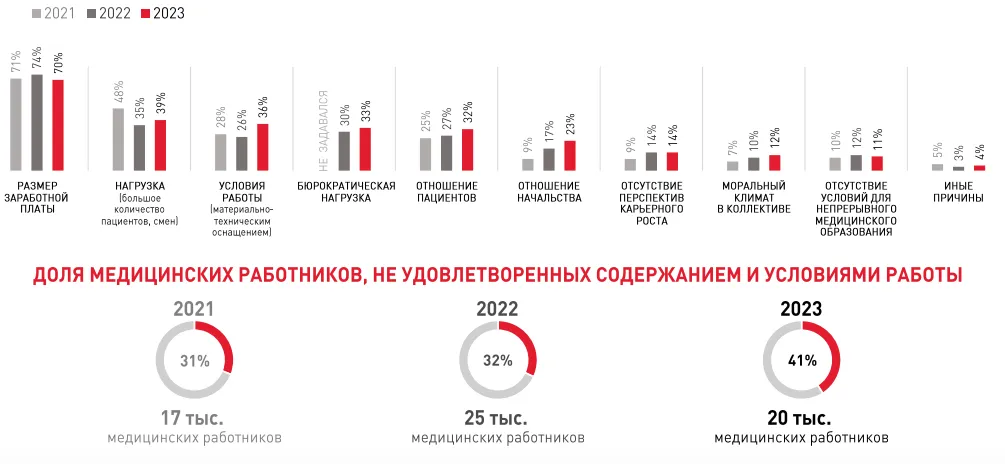 За последние пару лет, судя по данным всероссийского исследования, нагрузка на врачей немного снизилась. А вот условия работы стали ощутимо хуже: 36% в 2023 году против 28% в 2021-м.