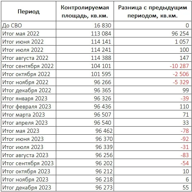 Таким образом, за год площадь контролируемых Россией территорий в зоне СВО уменьшилась на 92 квадратных километра.