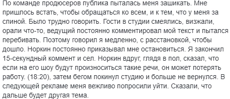 После речи одного из гостей передачи, украинского журналиста, писателя и режиссёра-документалиста Сергея Лойко о том, что «россияне — не свободные люди, а рабы», Норкин покинул студию. Это произошло на 18-й минуте программы, после чего сменилось ещё двое ведущих — Николай Гурнов и Иван Трушкин.