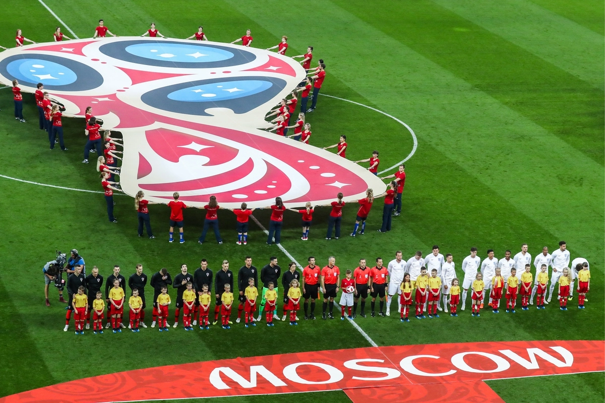 Игроки сборной Хорватии и сборной Англии перед началом полуфинального матча.