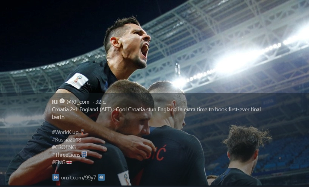 Матч полуфинала чемпионата мира по футболу завершился победой Хорватии, сборная которой обыграла английских футболистов со счетом 2:1.