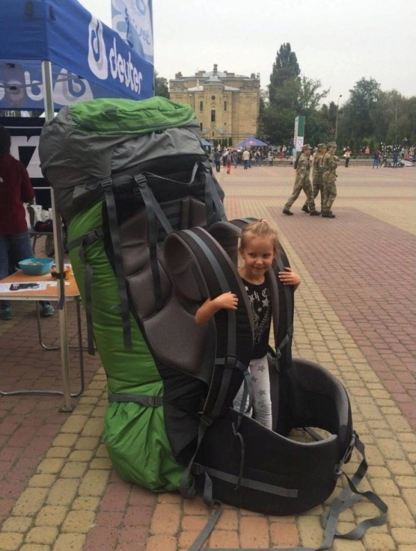 Этот походный рюкзак выглядит невероятно большим на контрасте с девочкой