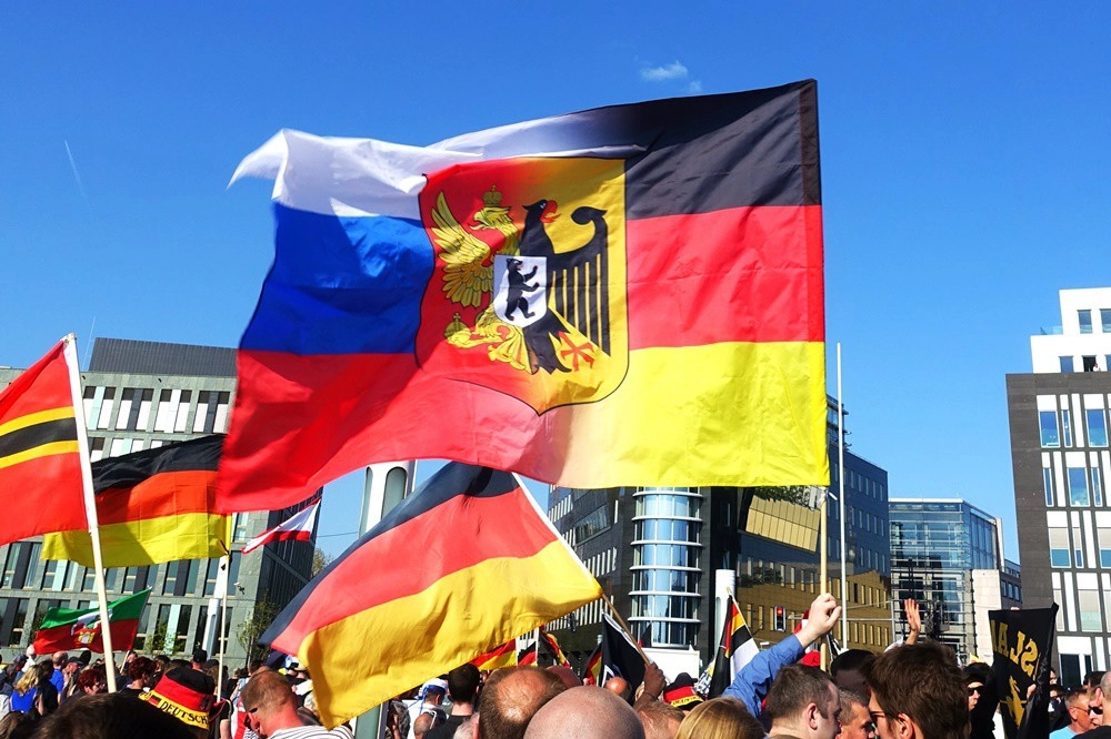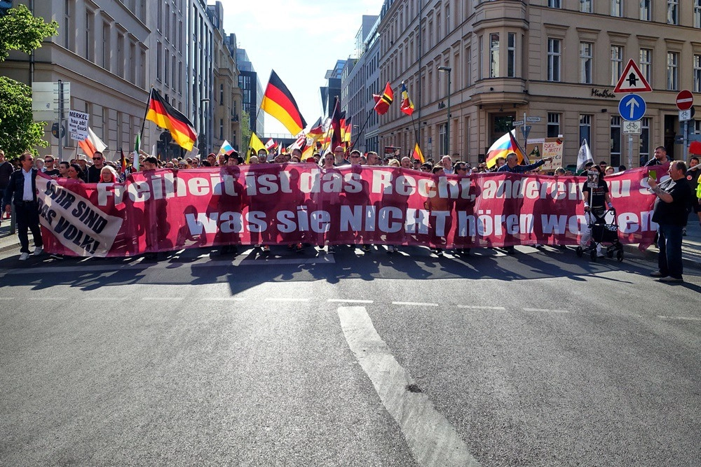 «Антифа» были толпы, но маленькими и разрозненными группами без общей организации. Ультраправые же построили собственную сцену, и что-то надрывно, подражая Гитлеру (хотя, возможно, любая немецкая речь со сцены звучит как у Гитлера) орали с неё, дружно размахивая немецкими, российскими флагами и полотнами с праворадикальной символикой, требовали единства с российскими братьями и ровно в назначенную минуту выдвинулись в шествие. Администрация Берлина не отличается фантазией: финальная точка их шествия была той же, что и у «антифа» — Berlin Friedrichstraße.