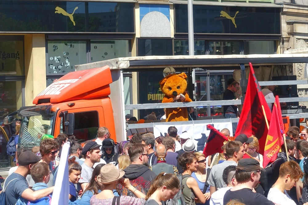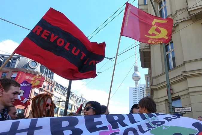 Марш «антифа» собрал по данным полиции 7,5 тыс. человек (но даже по приблизительным прикидкам автора репортажа, численность «левых» колонн превышала 10 тысяч) и прошел до станции Berlin Friedrichstraße под лозунгами «Революция», «Антикапитализм» и очень часто встречавшейся советской символикой.