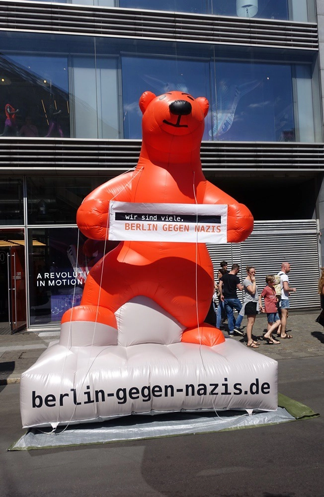 Демонстранты держали в руках плакаты с такими надписями, как «Берлин против нацизма» и «Беженцы, добро пожаловать».