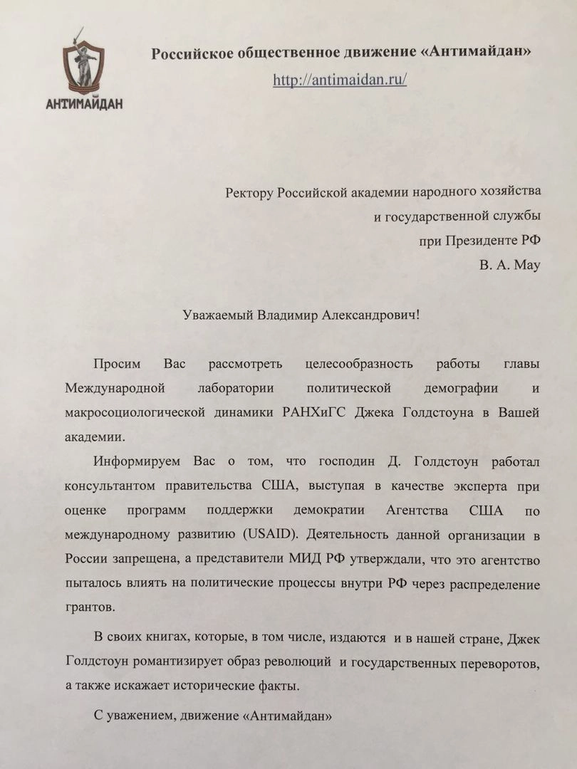 Официальное письмо от имени движения также было направлено ректору РАНХиГС Владимиру Мау.
