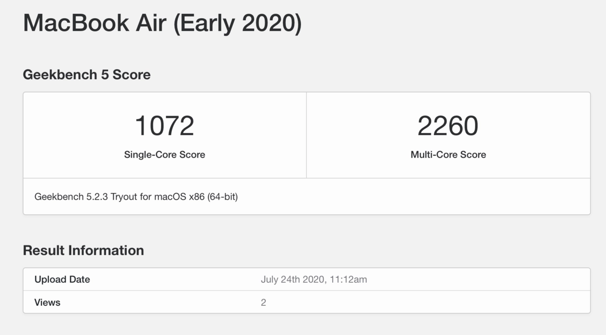У нас на тесте базовая версия с двухъядерным процессором Intel Core i3 и 8 Гб оперативной памяти. В обновленной линейке MacBook Air производитель использует процессоры класса Y (как в MacBook 12). Это специальные энергоэффективные чипы, предназначенные для ультратонких ноутбуков. Теплопакет процессора составляет всего 9 Вт. В бенчмарке Geekbench ноутбук набирает 1072 балла в одноядерном тесте и 2260 баллов в многоядерном. К слову, MacBook Pro 13 в одноядерном тесте вырывается вперед ненамного, но за счет большего количества ядер многоядерный тест он проходит значительно лучше.