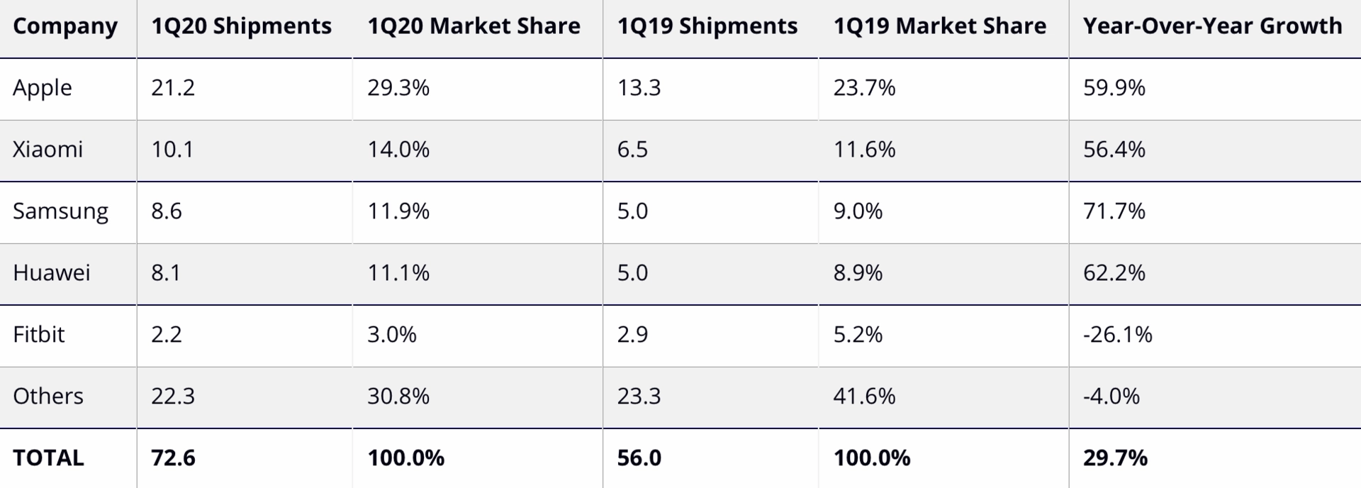 Всего в первом квартале было продано 72,6 миллионов устройств носимой электроники. Apple продала 21,2 миллиона девайсов, 4,5 из которых только Apple Watch. Такой результат позволил Apple стать лидером и занят 29,3% рынка носимой электроники. Но не только умные часы Apple Watch являются для Apple главным продуктом на этом рынке, у компании также есть две версии беспроводных наушников Apple AirPods.
