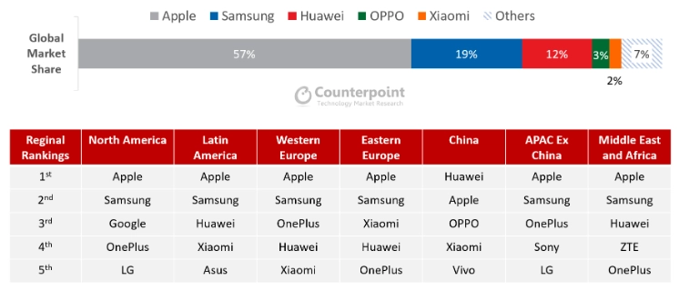 Лидером премиального сегмента стала американская компания Apple, которая заняла 57%. На втором месте оказалась южнокорейская компания Samsung с долей в 19%. Замыкает тройку лидеров китайский телекоммуникационный гигант Huawei с долей в 12%.
