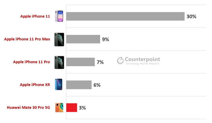 Самым интересным является то, что в рейтинге Топ-5 самых популярных премиальных смартфонов представлено четыре устройства Apple. Самым популярным оказался iPhone 11, который занял 30% от общих продаж премиального сегмента. Следом идут iPhone 11 Max Pro (9%), iPhone 11 Pro (7%), iPhone XR (6%) и Huawei Mate 30 Pro 5G (3%). В случае с аппаратом Huawei интересно также то, что он стал первым 5G смартфоном в этом рейтинге.