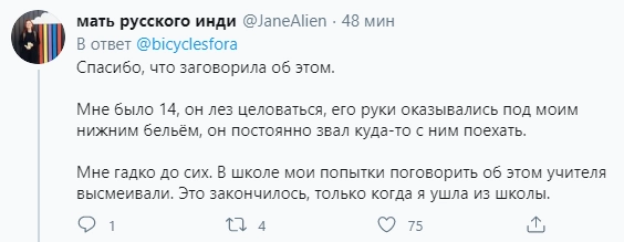 Недавно в Twitter появились сообщения от женщин и девушек, а иногда и молодых людей о сексуальных домогательствах со стороны известных деятелей российских СМИ: шеф-редактора и фоторедактора «МБХ медиа» Сергея Простакова и Андрея Золотова, ведущего канала «Дождь» Павла Лобкова, спецкорреспондента «Таких дел» и главреда самиздата moloko plus Павла Никулина и других людей, известных в мире независимых медиа. Фигуранты скандала уже принесли извинения за неподобающее поведение, многие уволились с работы.