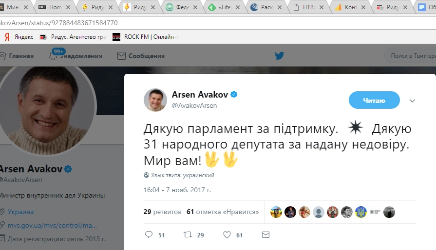 «Благодарю парламент за поддержку. Благодарю 31 народного депутата за оказанное недоверие. Мир вам», — написал глава МВД в своем микроблоге в Twitter.
