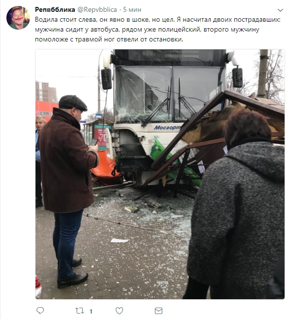 «Я насчитал двоих пострадавших: мужчина сидит у автобуса, второго мужчину помоложе с травмой ног отвели от остановки», — пишет очевидец.