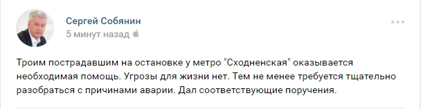 Мэр Москвы Сергей Собянин сообщил, что медики оказывают пострадавшим помощь. Угрозы для их жизни нет.