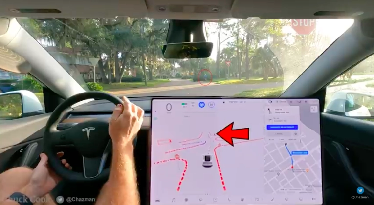 На днях появилось новое видео, на котором можно заметить, как электромобиль подъезжает к перекрестку, останавливается перед знаком «Стоп», и когда начинает пересекать перекресток, на переходе с другой стороны появляется пешеход.
