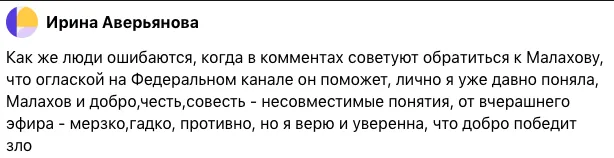 Поразительно, но комментарии о продажности Малахова умудрялись оставлять даже в сообществе «России-1» во «ВКонтакте» под публикацией о спецвыпуске передачи «Синяя птица и друзья», посвященном мамам и бабушкам.