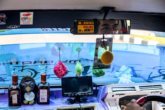 Вот водительское место изнутри. Тут помимо наклеек еще куча барахла всякого на передней панели, и все это болтается, звенит, брякает на бесконечных ухабах и кочках. Но без этого видимо водителю никак нельзя — талисманы, обереги и прочие полезные вещи.