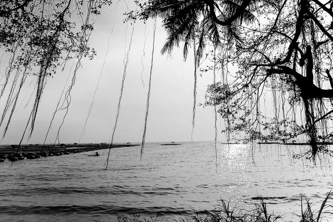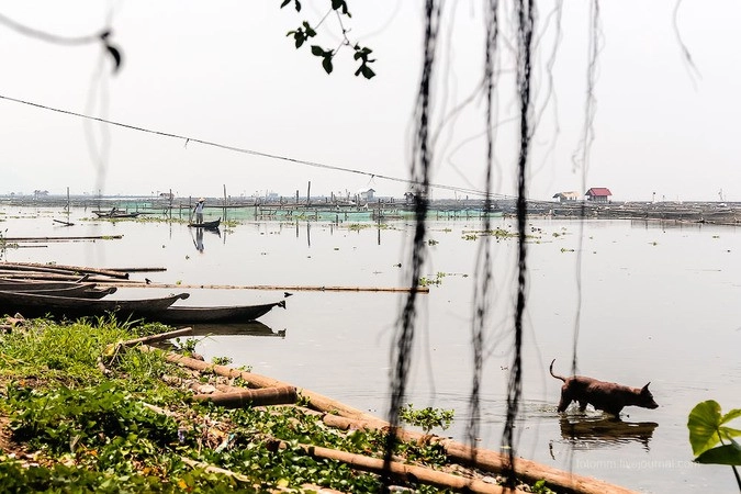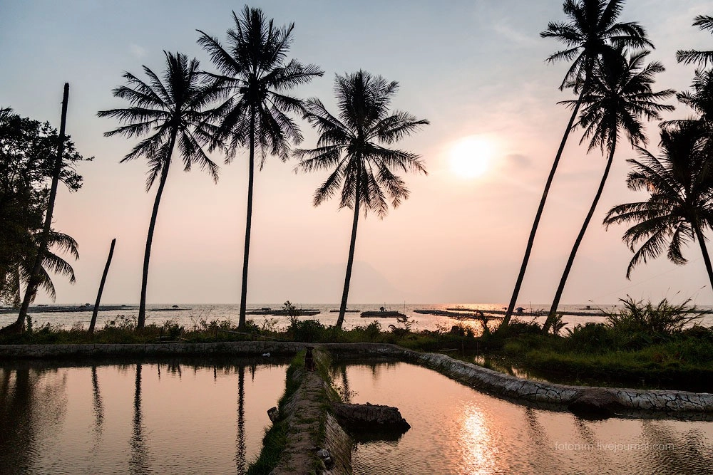 Наконец где-нибудь подальше от деревни, на берегу мы ставим палатку и любуемся рыбными фермами на закате и тихо проплывающими мимо нас лодками.