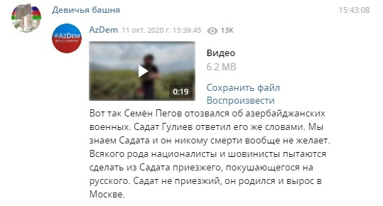 Тем временем Следственный комитет РФ проверяет блогера и военного эксперта из Москвы Садата Гулиева. Интерес правоохранителей вызвала публикация в его Telegram-канале «Девичья башня» от 10 октября, где Гулиев отметил, что Пегов прибыл в район города Гадрут в «зоне безопасности» непризнанной Нагорно-Карабахской Республики.