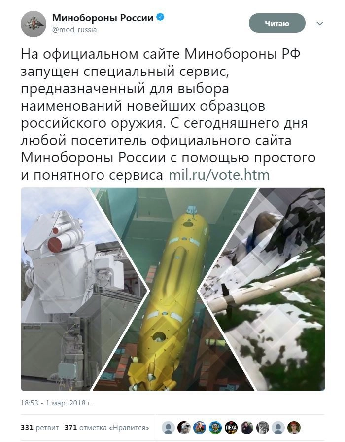 Министерство обороны России открыло на своем официальном сайте специальный поддомен для приема предложений по названию трех новейших оружейных систем, которые превосходят все имеющиеся перспективные разработки других стран в этой сфере.