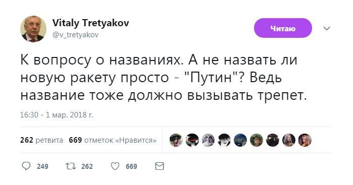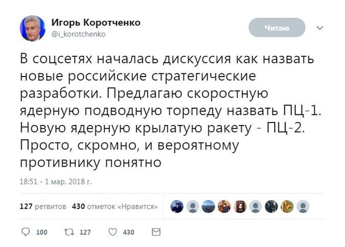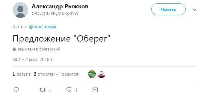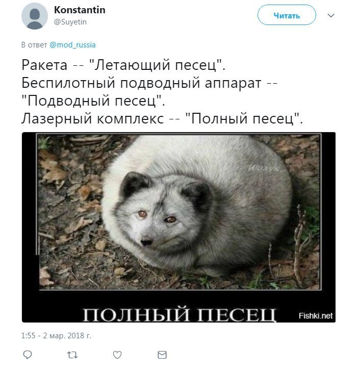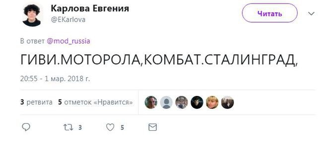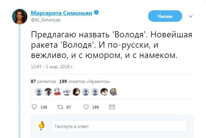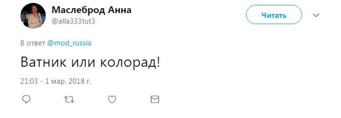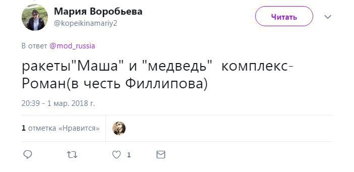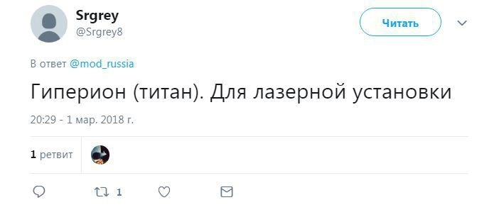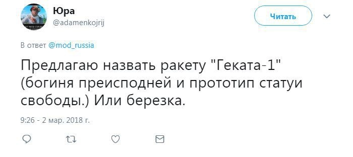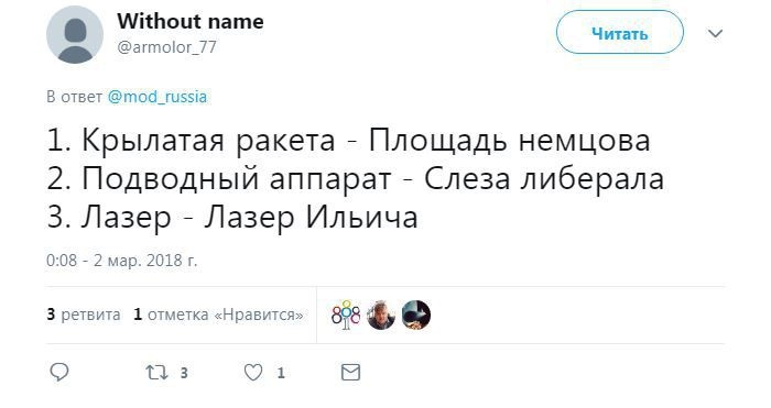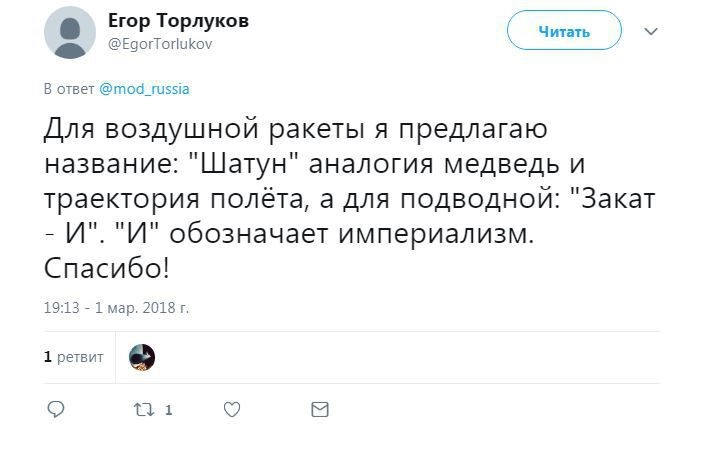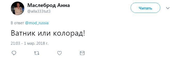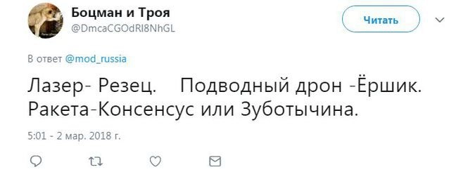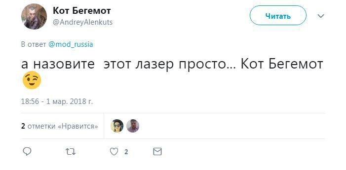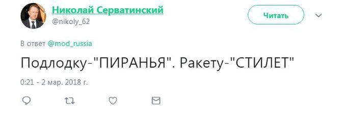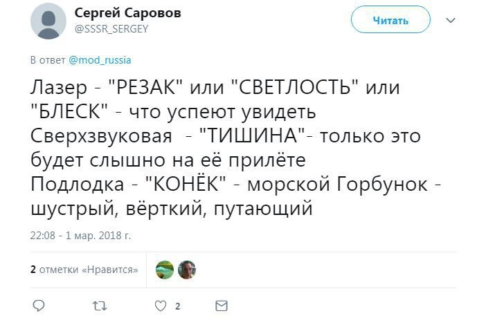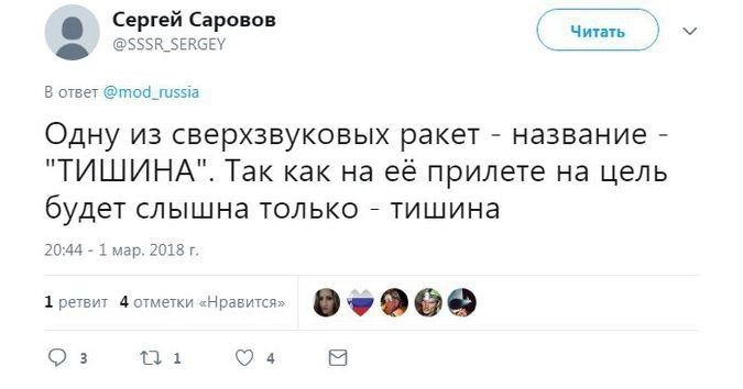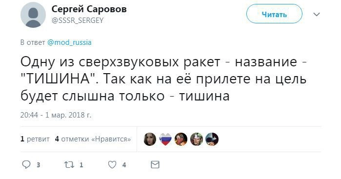 Член комитета Госдумы по безопасности и противодействию коррупции Адальби Шхагошев настаивает на варианте «Тишина». Судя по комментариям к официальному Twitter Минобороны РФ, это действительно популярный вариант. Также прозвучало немало юмористических предложений.