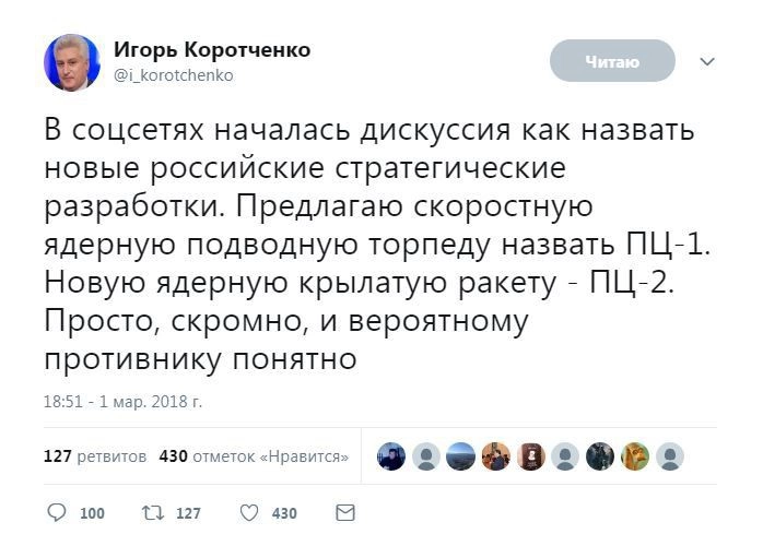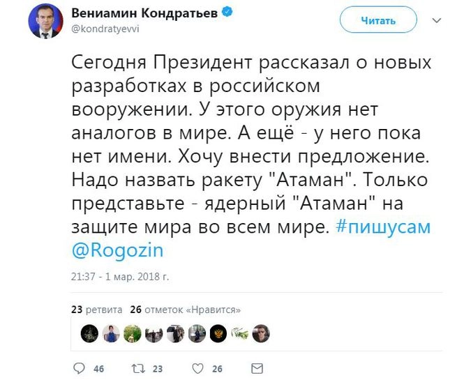 Наряду с блогерами не отказали себе в удовольствии принять участие в конкурсе на лучшее название общественные деятели и политики, в том числе высокопоставленные. Так, губернатор Кубани Вениамин Кондратьев предложил название для новой российской крылатой ракеты с ядерной энергоустановкой — «Атаман». Первый вице-спикер Совета Федерации Николай Федоров считает, что подошло бы название «Американская мечта».