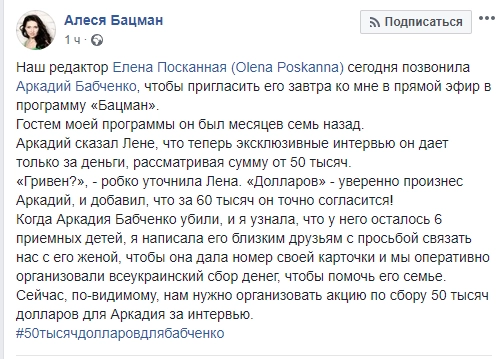 Редактор украинского издания «Гордон» Алеся Бацман сообщила в соцсетях о том, что недавно «воскресший» российский журналист Аркадий Бабченко запросил за беседу со СМИ 50 тысяч долларов (около трех миллионов рублей).