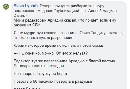 Были сведения и о том, что Бабченко якобы должен спрашивать разрешения на встречу со СМИ у СБУ.