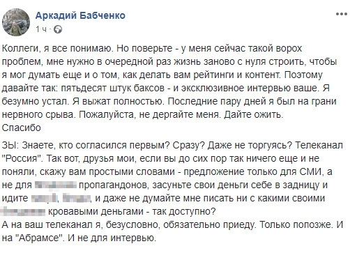 Поэтому давайте так: пятьдесят штук баксов — и эксклюзивное интервью ваше. Я безумно устал. Я выжат полностью. Последние пару дней я был на грани нервного срыва. Пожалуйста, не дергайте меня. Дайте ожить, — просит Бабченко.