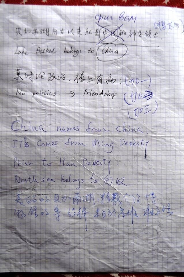 Дальше опять по-китайски кто-то уточняет, что Байкал был китайским морем со времён династии Цин (середина XVI века)! Оказалось, что книга отзывов может быть предметом разборок и раздора!