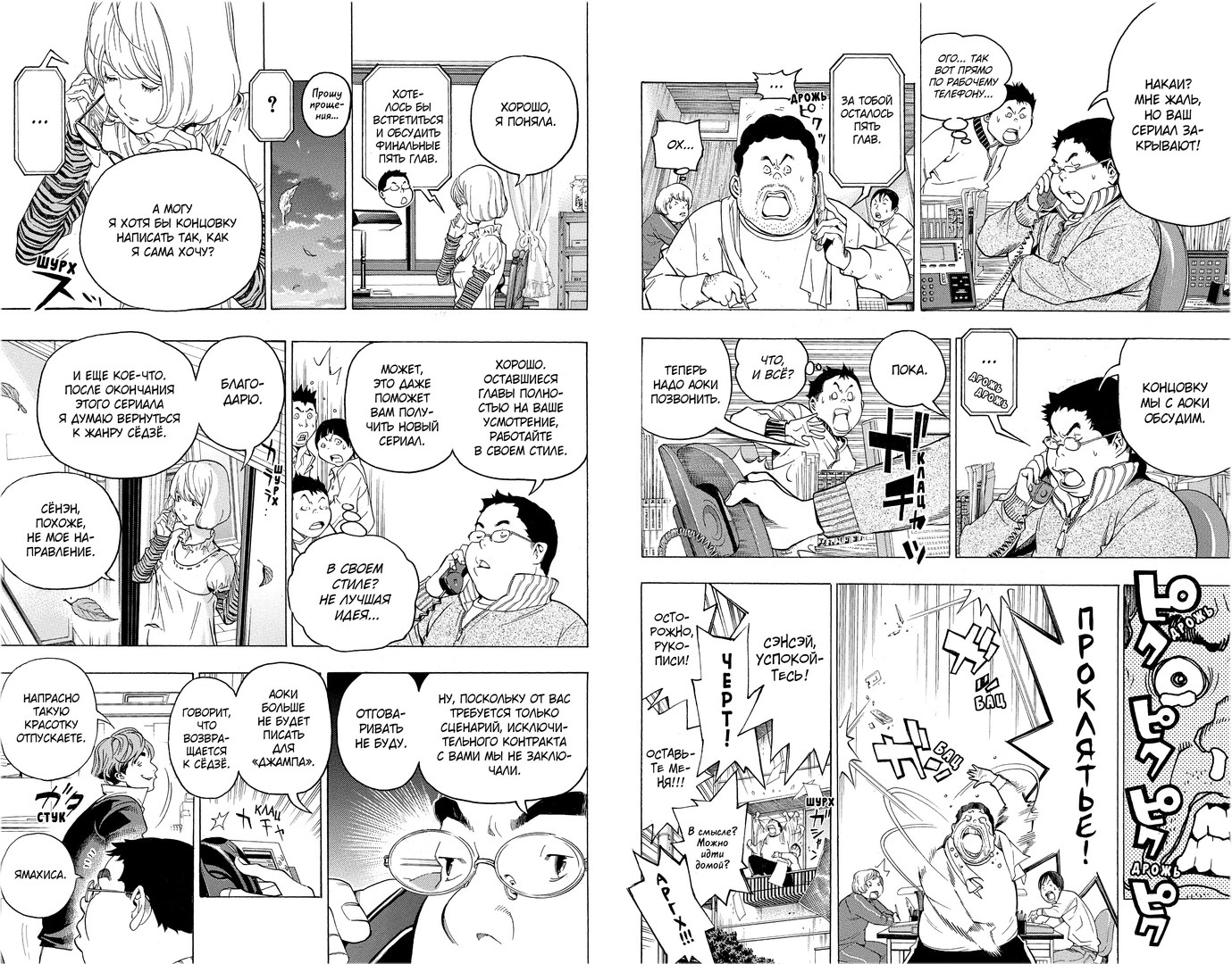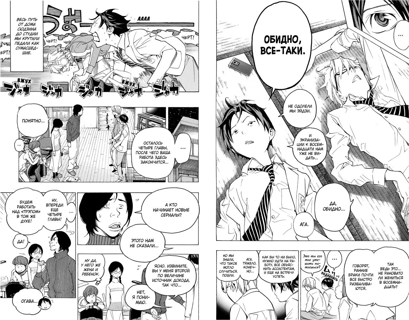 Такие вот юношеские страсти, такое вот воспитание чувств… Не зря один редактор советует своему подопечному: «Личная жизнь мангаки — это постепенное движение к успеху, а не ураган эмоций. Тебе нужен режим, который сбалансирует твою личную жизнь и карьеру». И обещает устроить ему свидание с красоткой — но только когда тот сдаст готовые три главы.