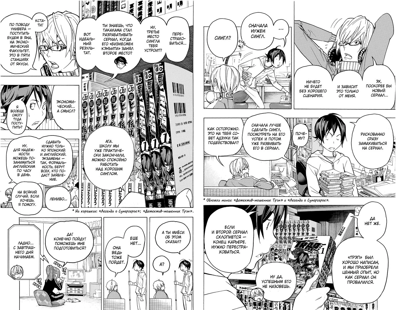 И при этом ребята поступают в университет, наученные горьким опытом: «Мангака без манги — это обычный безработный». И вот здесь-то у них волей-неволей начинают поигрывать гормоны: заглядываясь на красивых студенток, оба парня вздыхают — мол, «хорошо быть молодым» — и признают: «А мы свою молодость принесли в жертву манге».