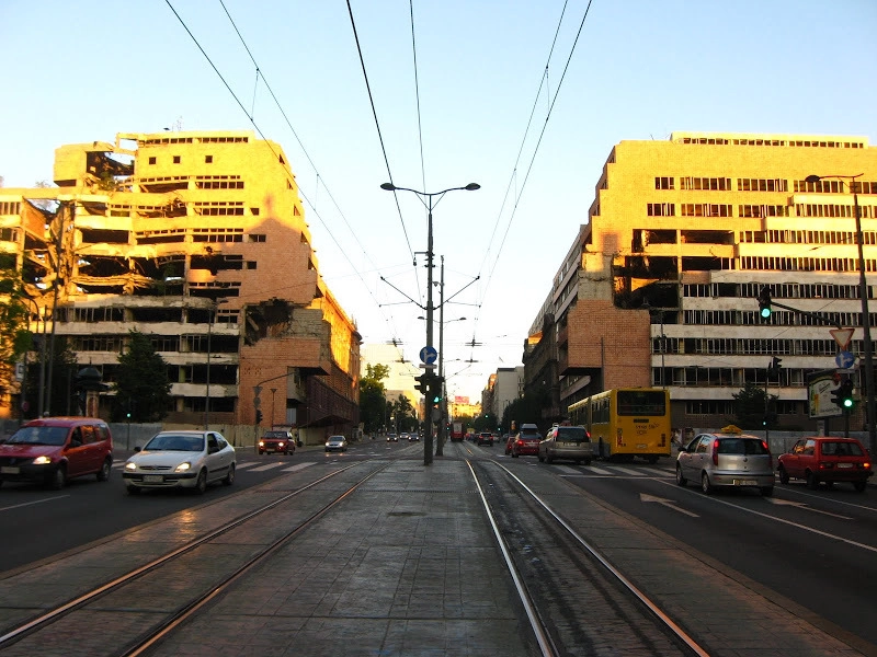 Белград. Руины генерального штаба югославской армии. С марта по июнь 1999 года вся территория Югославии активно бомбилась авиацией НАТО. Погибло несколько токоло двух тысяч человек, было разрушено множество домов, дорог, нанесён значительный урон инфраструктуре страны.