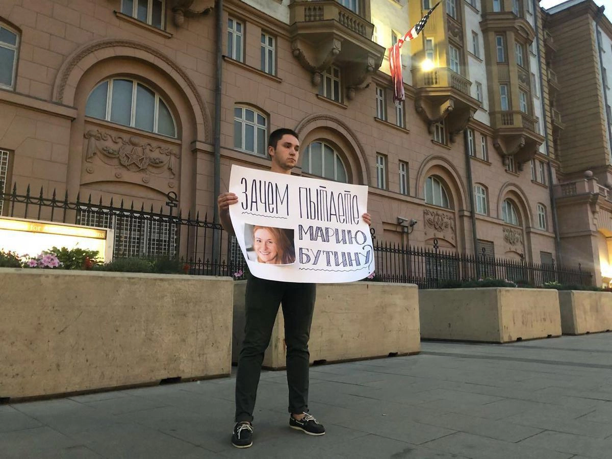 По словам участника мероприятия, поводом для протеста стало то, что власти США, по его мнению, незаконно удерживают россиянку Бутину в тюрьме.