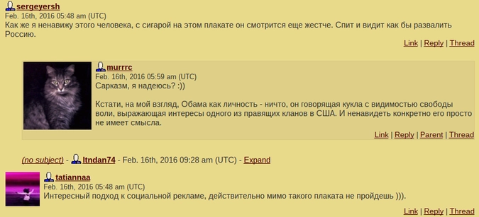 Зато в «Живом Журнале» комментарии кардинально отличаются: социальная реклама с главой США впечатлила пользователей платформы для блогов куда больше, чем обитателей Twitter. Некоторые блогеры даже провели подробный анализ портрета Обамы.
