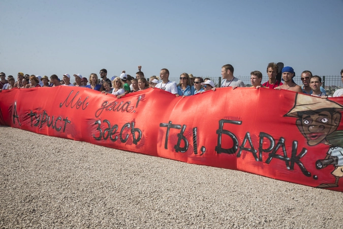 Барак Обама на плакате был изображен как стереотипный турист — с фотоаппаратом и в шортах. В ходе акции молодежь скандировала: «Крым наш! Мы дома! Барак, турист здесь ты!».