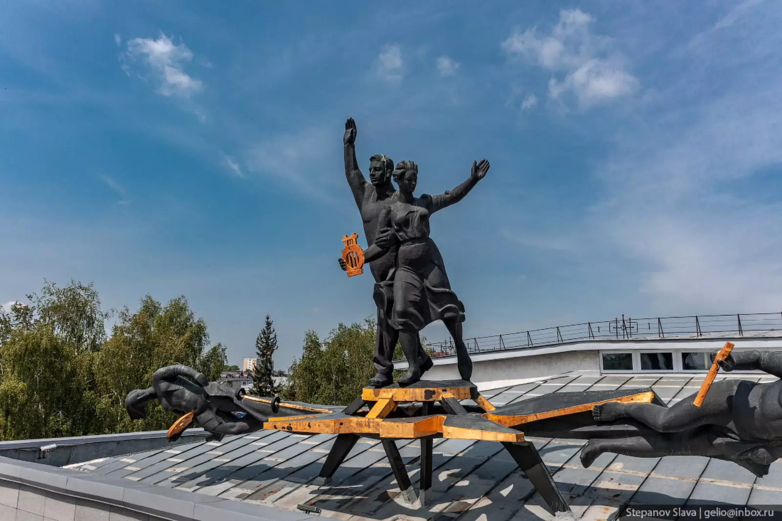 29. Скульптурная композиция «Искусство и народ». По замыслу художников, скульптуры призывают народ в мир искусства, о чем свидетельствует два главных персонажа: мужчина и женщина — рабочие, которые держат в руках лиру.