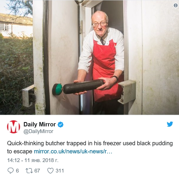 В Великобритании 70-летний мясник Крис МакКейб из города Тотнес в графстве Девоншир, что в Юго-Западной Англии, оказался запертым в холодильнике собственной лавки, пишет британский таблоид Daily Mail.