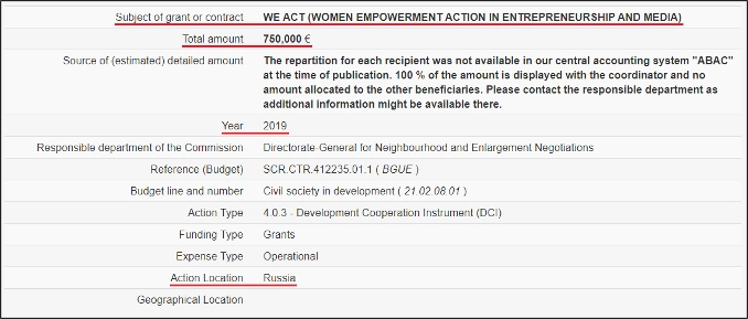 ВВС и Еврокомиссия выделили грант в размере 56,2 миллиона рублей (750 тысяч евро) на проект «WE ACT», ориентированный на Россию. Заявленной целью проекта является усиление позиций женщин в предпринимательстве и СМИ.