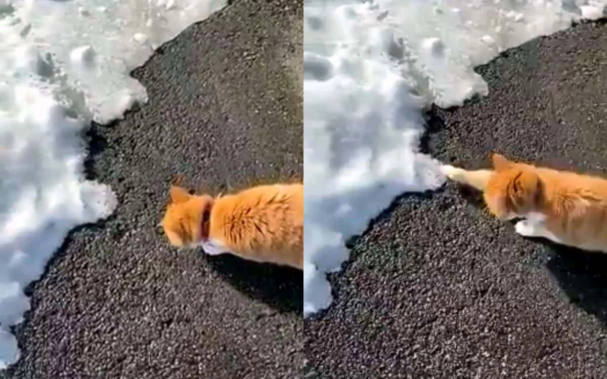 Животное явно никогда раньше не видело вблизи это непонятное, холодное и колючее вещество. Кот осторожно протягивает лапу, но даже потрогать неизведанное решается не с первого раза.
