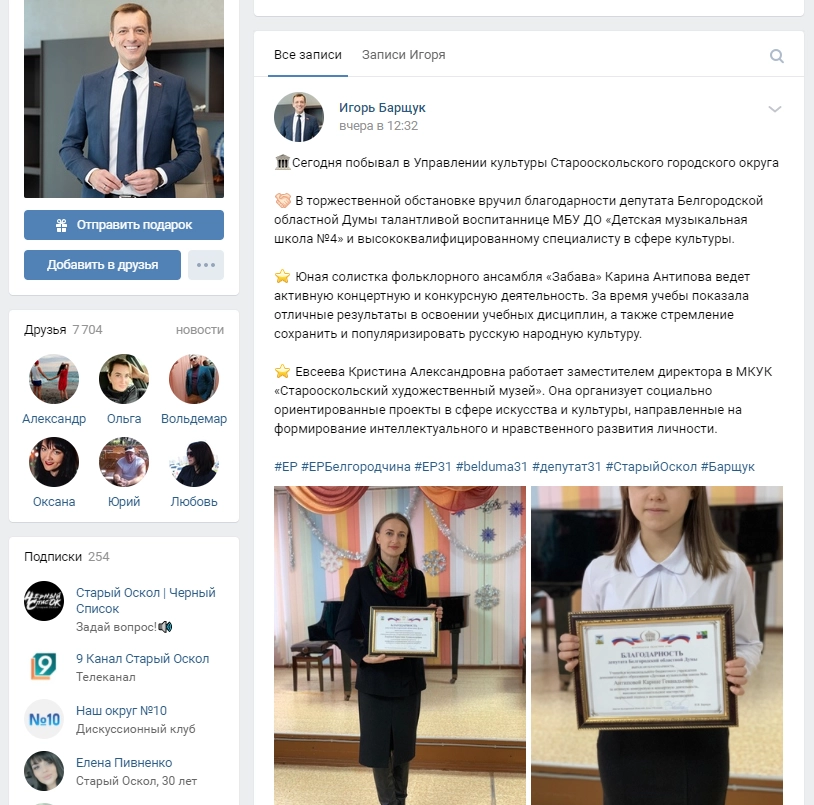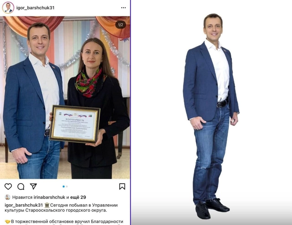 Депутат Игорь Барщук из Белгорода опубликовал в своих социальных сетях фотографию, на которой он запечатлен якобы в Управлении культуры Старооскольского городского округа. На фотографии он вручал награду заместителю директора местного художественного музея. Вот только пользователи, которые давно следят за его деятельностью, сразу определили, что это фотошоп.